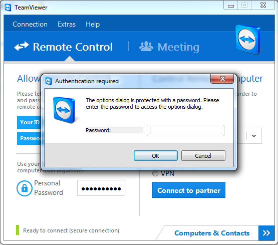 TeamViewer kysyy sinulta asiakkaan salasanaa, kirjoita se ja jatka painamalla OK